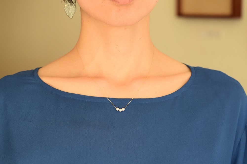 1番長くしてお洋服の上にのせて。(3粒と5粒をそれぞれ着用)