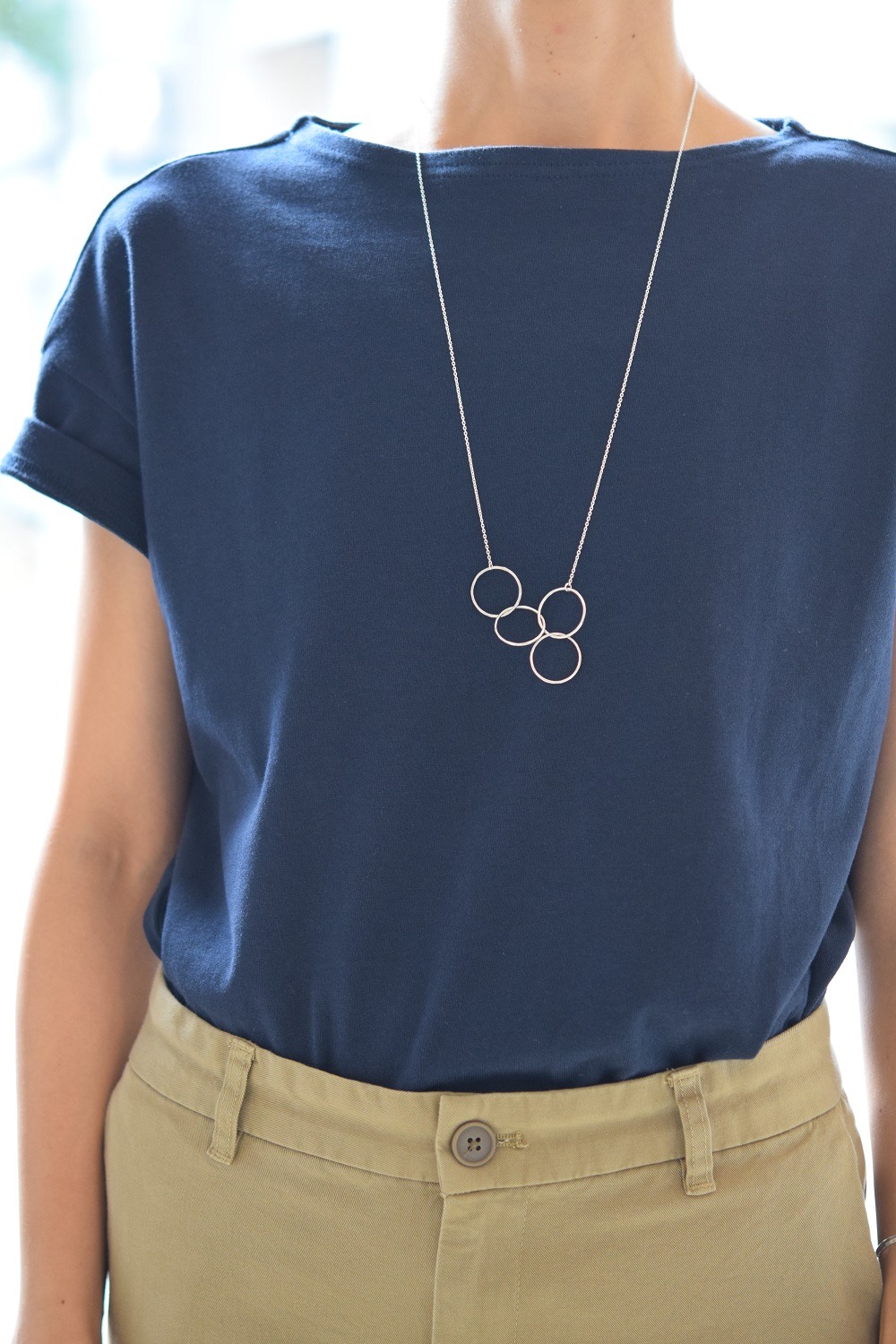 胸元でシャランと揺れる、銀色の輪が美しいデザインです。
