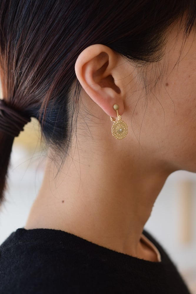 パールの凹凸から生まれる柔らかな輝きと、マットな質感の鈍い輝きの真鍮。