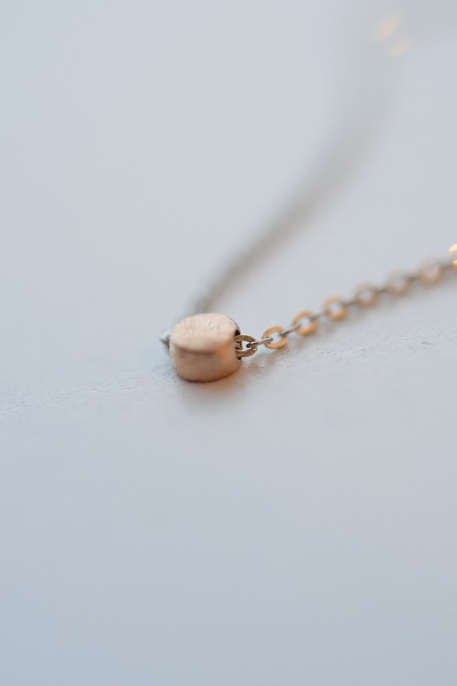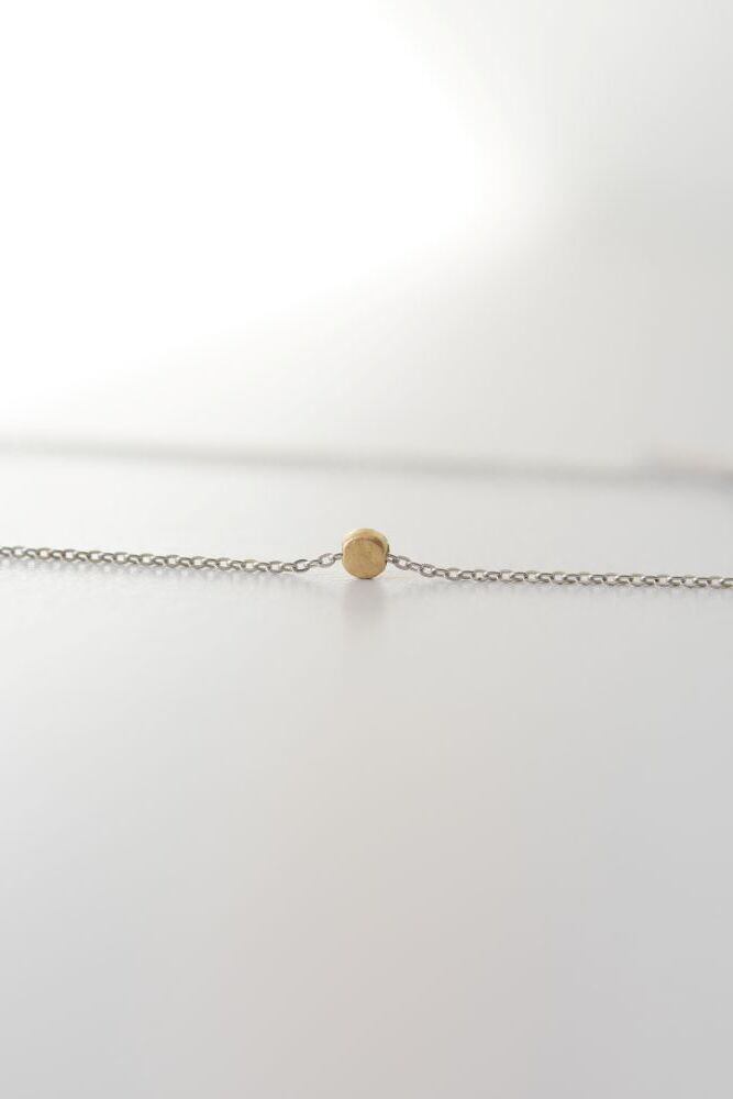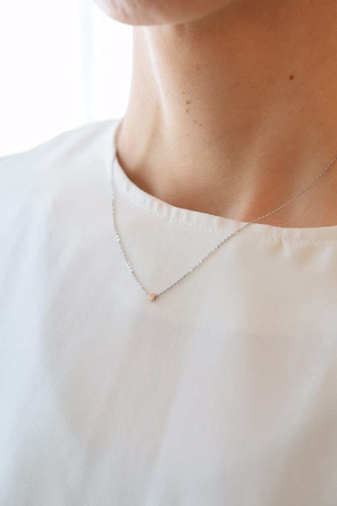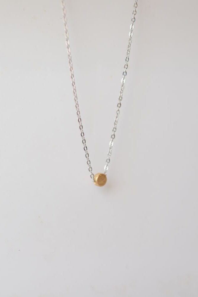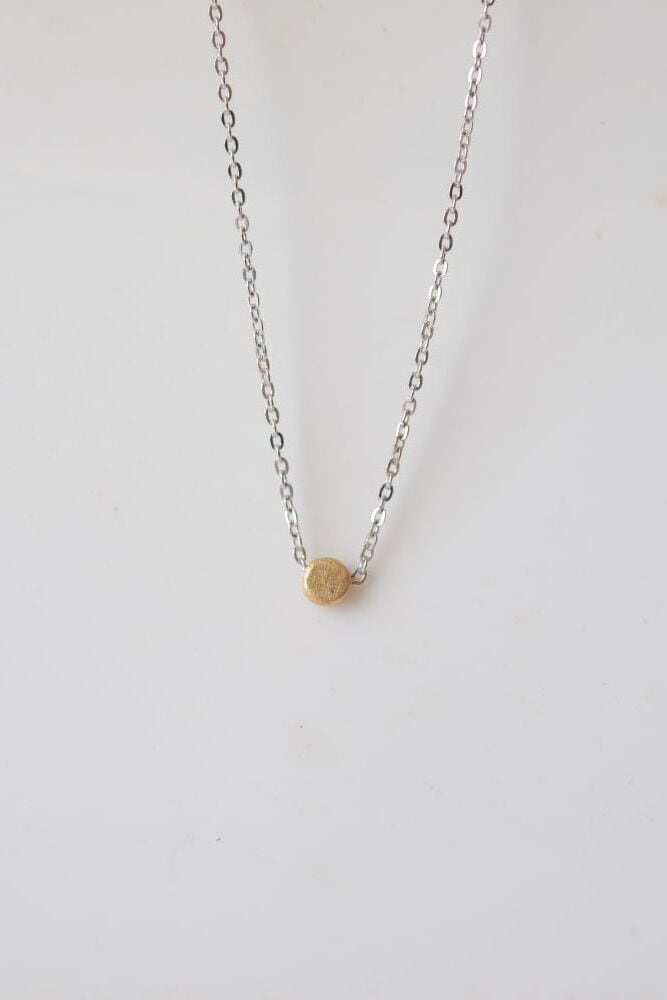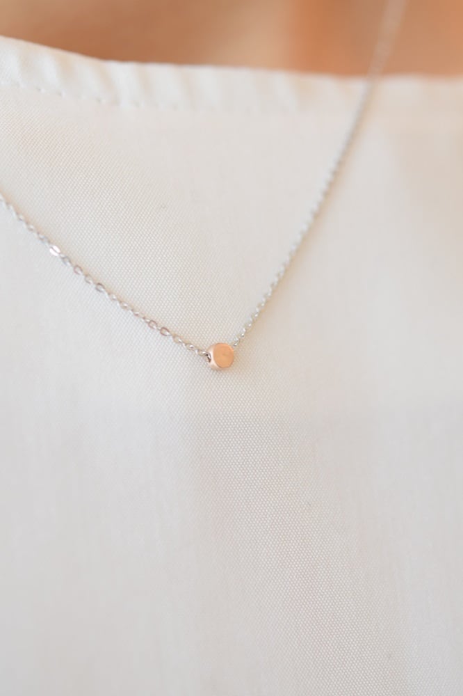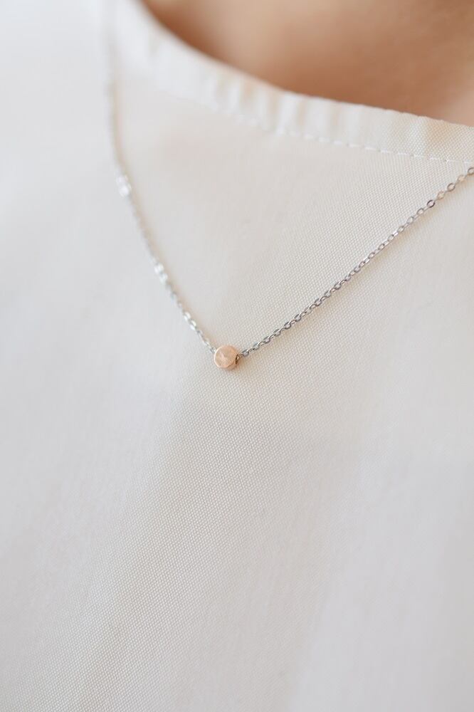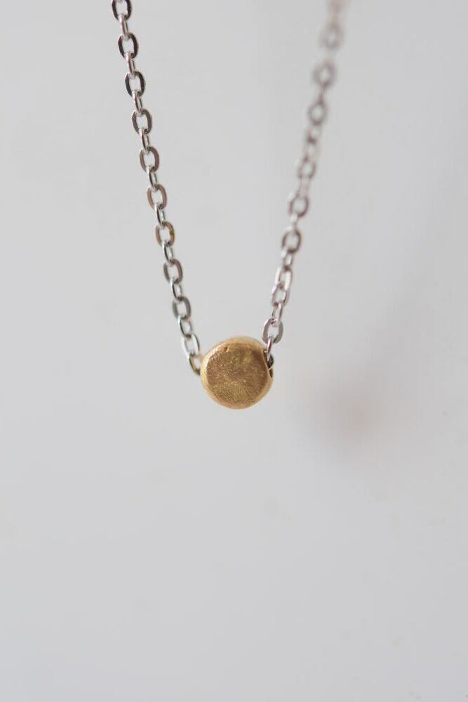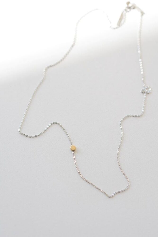 シルバーのチェーンにK18ピンクゴールドの小さなまるいモチーフを通したシンプルなネックレス。