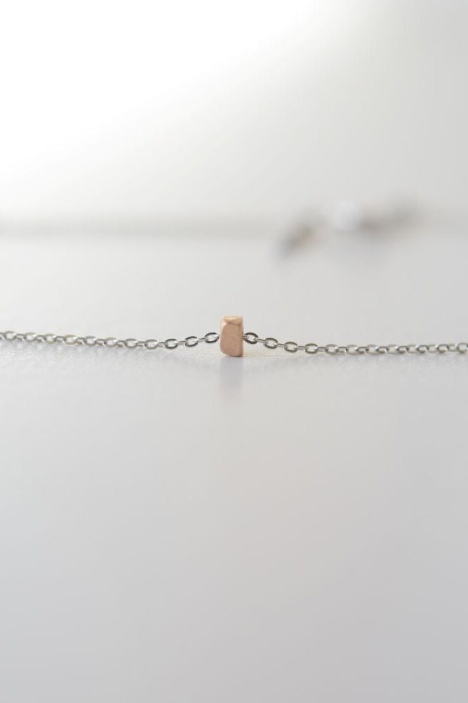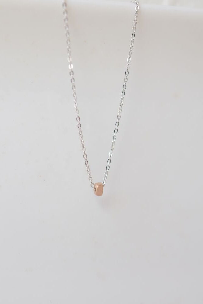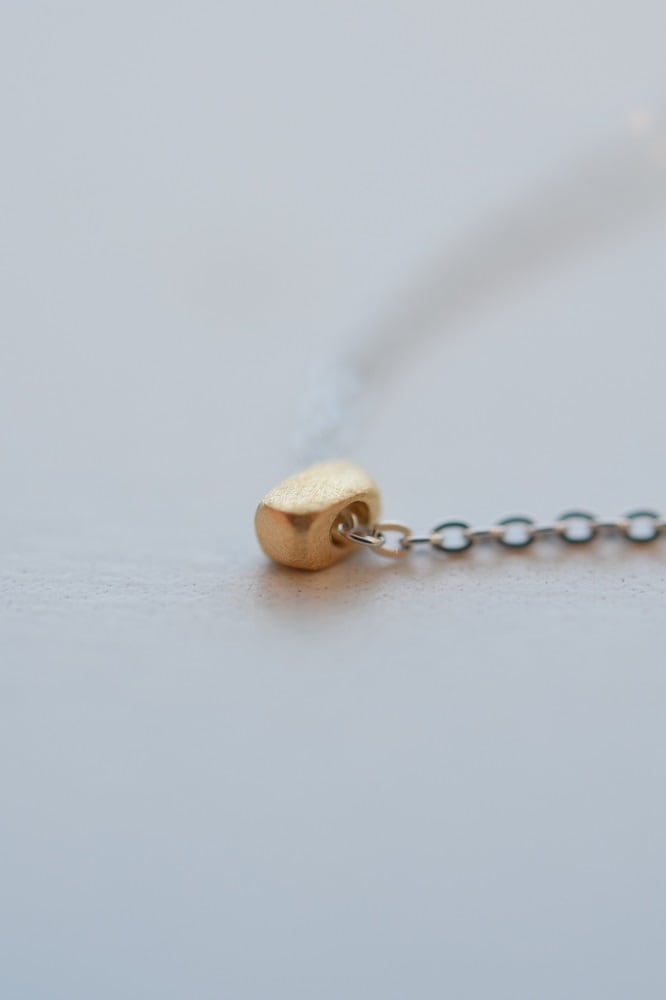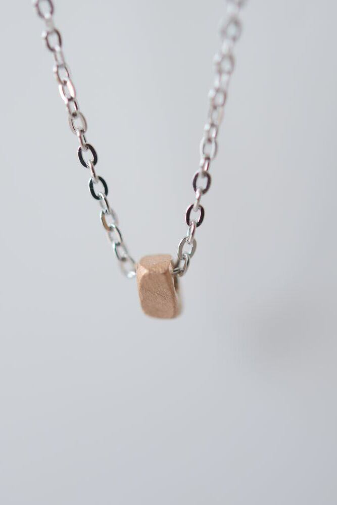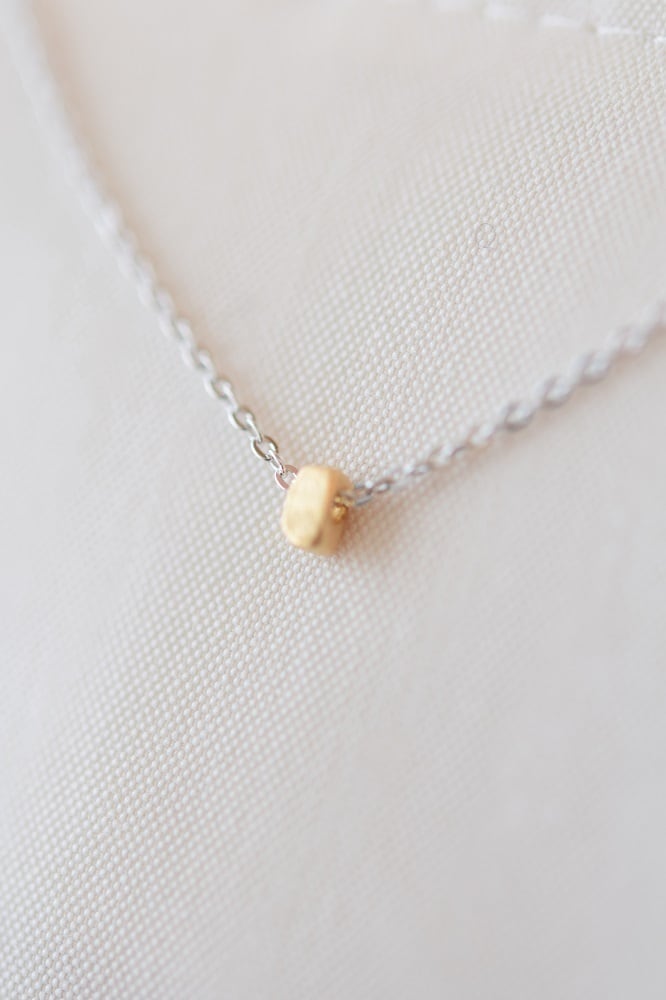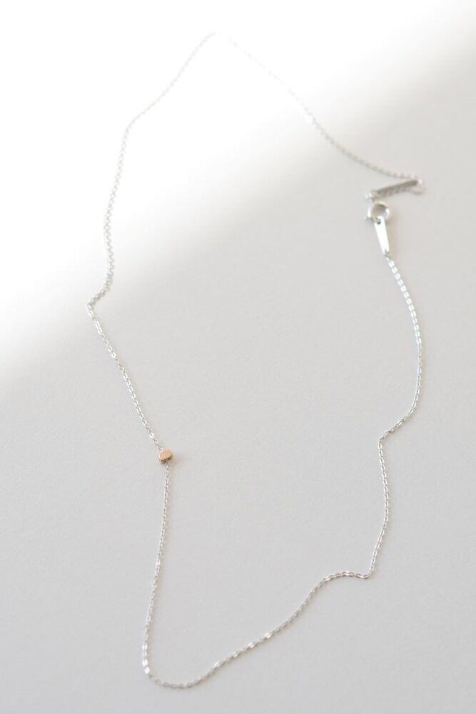 シルバーのチェーンにK18ゴールドのt小さなしかくいモチーフを通したシンプルなネックレス。