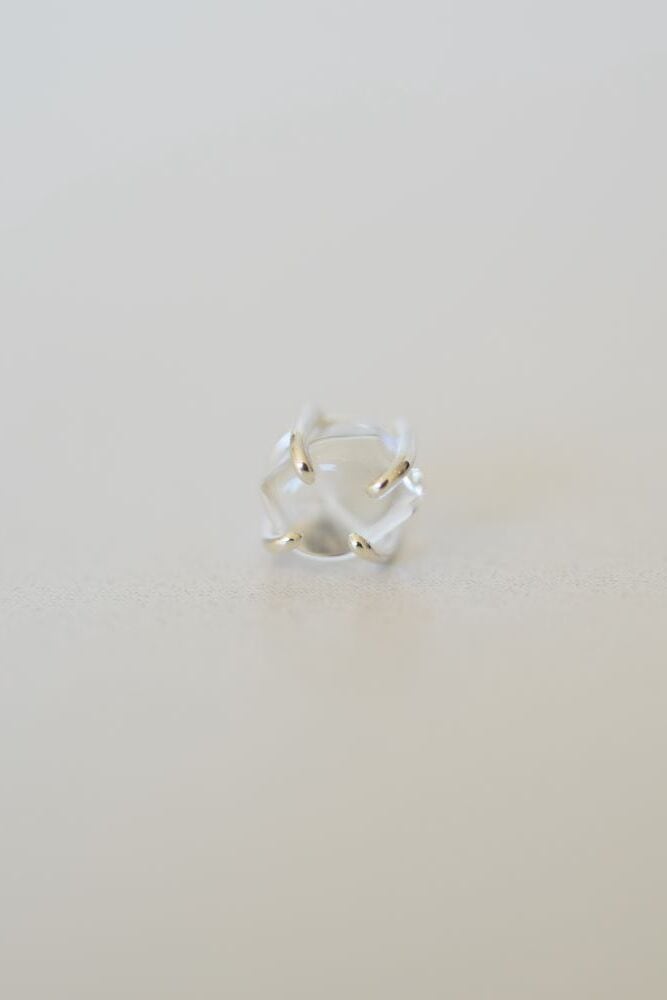 ガラスパーツは〈ハリオランプワークファクトリー〉によるオリジナル、ひとつひとつ職人の手作業で作られています。強度と透明感があり、カットを施していないとろみのある表面は光を受けて柔らかく輝きます。冬はクリーンに、夏は涼しげに感じられる素材です。